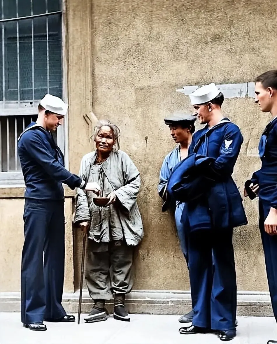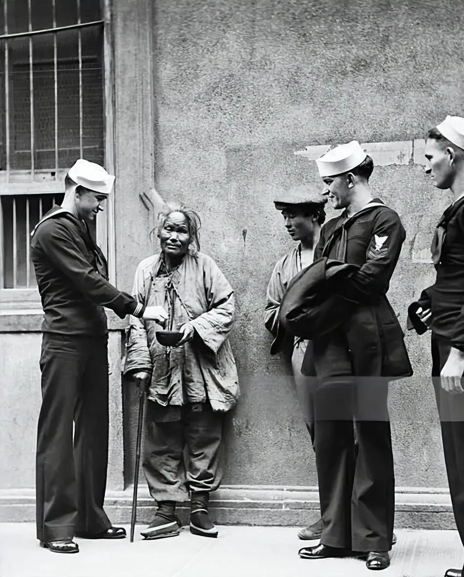 1930年,旧中国上海租界里的几名美国水兵,其中一人正以施舍的姿态,将钱递给面前的中国老人。老人衣衫褴褛、满是补丁,枯瘦的手捧着破碗,拄着拐杖,神情麻木又带着窘迫的卑微;