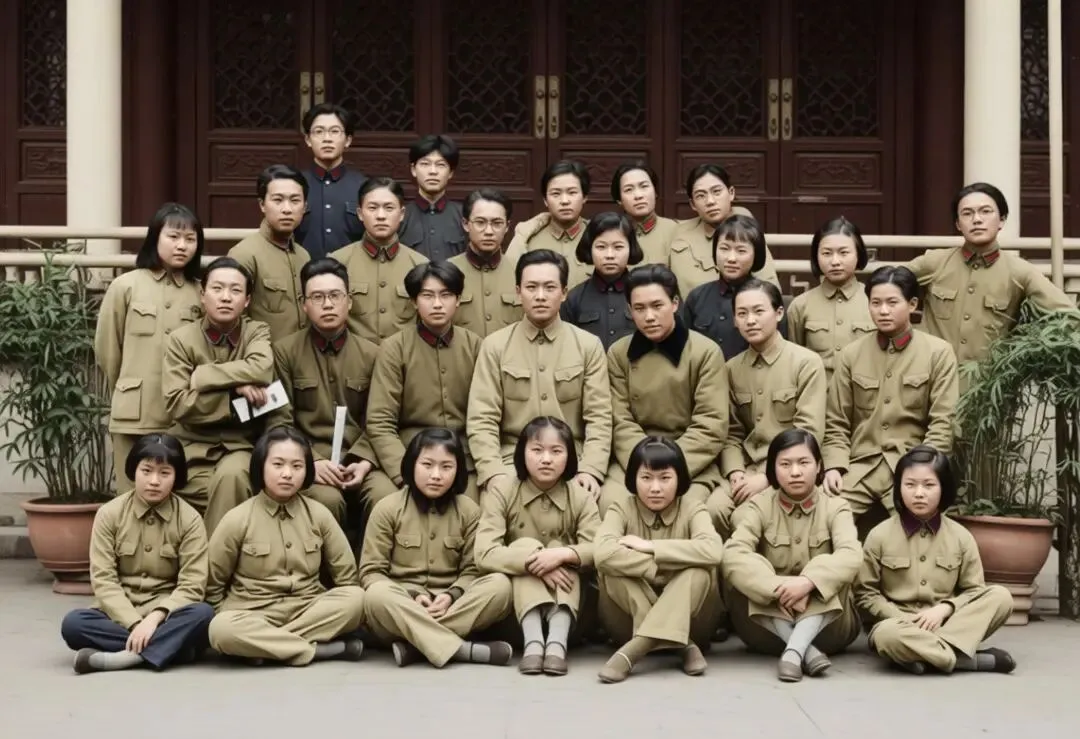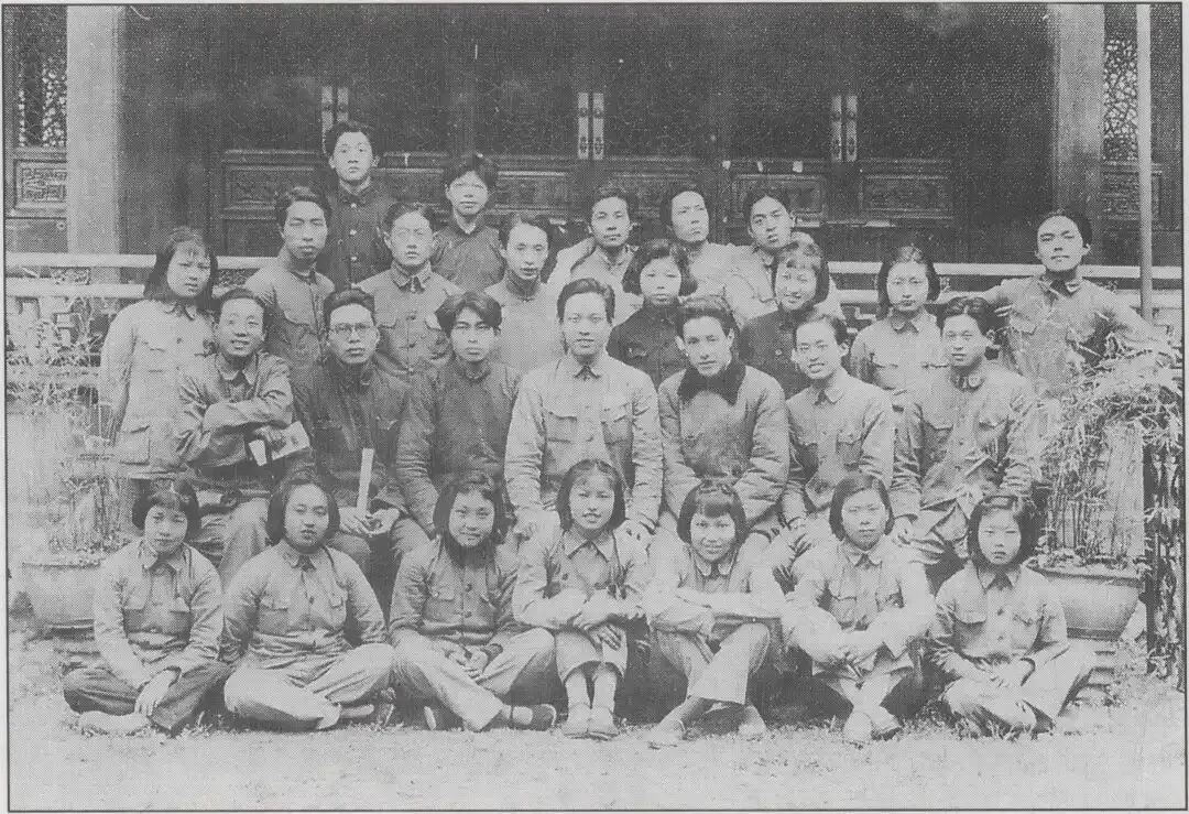 1940年,浙江绍兴觉民舞台前,一群身着朴素制服的青年男女整齐排列。前排女队员坐姿端正,神情沉稳;后排队员身姿挺拔,带着演完话剧《魔窟》后的热忱。