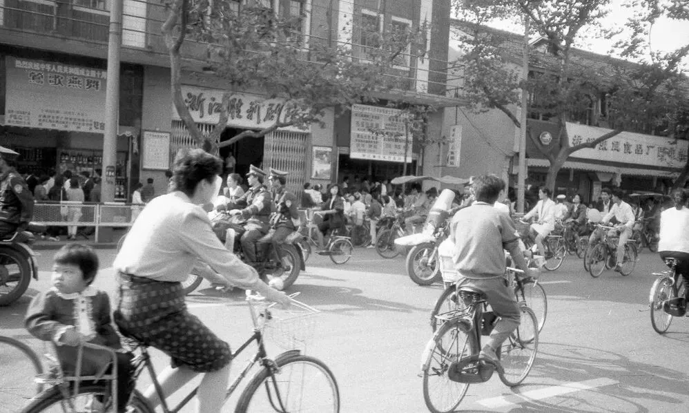 马路是自行车、摩托车各走各的,对面就是胜利剧院。现在这条路应该早变了模样。