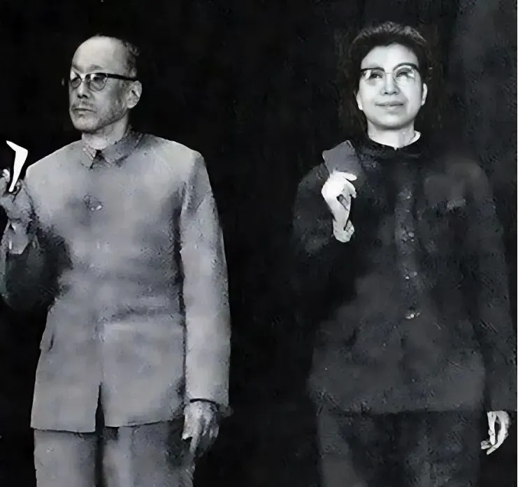 图中左边是康生,右边是江青,两个人手里各举着一本小书,站得笔直,衣服颜色都偏灰,挺板正,江青正脸朝前,微微一笑,眉头舒展,镜片后目光有点温和的意思,气色看起来不错,一派自信,身形显得饱满,康生那边就明显瘦得多,西装袖口有些空落,脑袋偏着,有点稀疏的发,眼神淡淡的,透着冷静,说是严肃也行,整个人紧着劲,仿佛不太想让人靠近,两个站一起,气场刚好一软一硬,加在一块倒挺特别。