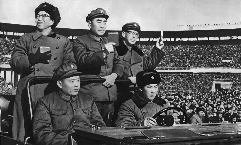 照片里人多,江青、总理、康生三人齐刷刷坐在吉普车里,周围人头攒动,接见青年队伍,场面别提多热闹,江青这会儿满面笑容,头戴军帽,手套也在,坐姿板正,看得出心情好,总理常带那股书卷气,看着旁边人照应得很细致。