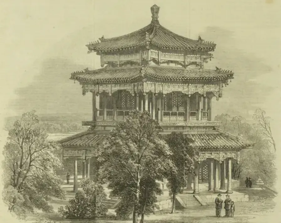 图上这刻刀下的楼亭就是圆明园中的宫殿,画得精细,梁柱全带花纹,双层屋顶像叠起来的波浪,一旁树木抱得紧紧的,最底下站着两个穿袍子的老先生,衣角随风动,一时安静又稳当,画师下笔讲究,没真看过原物,这画稿也算是留下一份影子,“乾隆那会的讲排场全在这些细节里”,有点古早电影的意思。