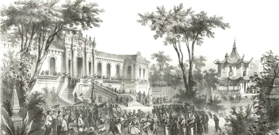 这幅法军营地,墩台前后都是人影,洋兵窝在墙角晒太阳,马队刚卸鞍子,地上还扔着一堆稻草包,看着就能闻见烟火混着生铁的味道,那年代东西不全归自己,胜景也成了别人的营地,前院子后大殿一通乱,图画上要是再细画几只流浪狗,这废墟的意味就更足了。