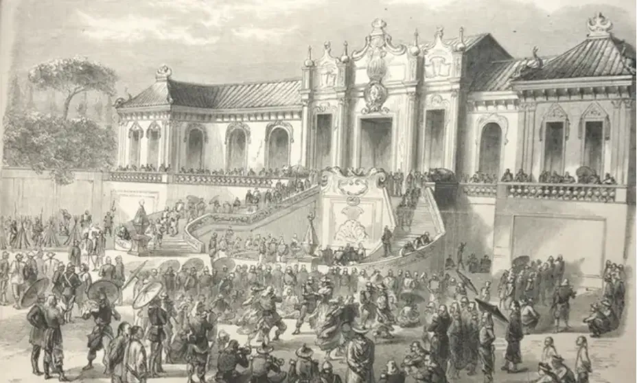 说到联军进了园子,当年场面混乱不堪,这幅画叫英法联军占领圆明园,台阶上一片人,大部分洋人西装礼帽,小部分拉着兵器,远看就是一团糊,宫殿的高墙大窗站满了人,里头外头都比着谁更有气势,师傅那时教课扔下一句,“看热闹的不嫌事大,倒霉的是屋里的东西”,图上这场景,老宫里的人谁也忘不了。