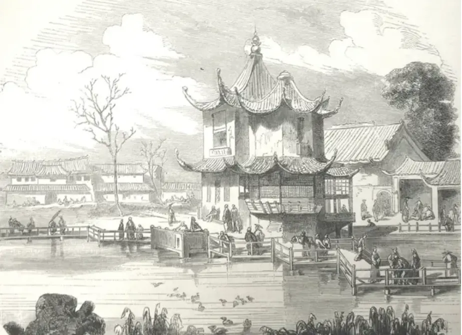 最后一张,是圆明园花园的素描,水面一圈圈荡开,桥板与园墙错落有致,亭子临水悬着,台阶边正有几个穿长衫的在聊,岸上柳树刚冒芽,一群孩子在水边追鸭子,热闹归热闹,画上留了点空白,那叫“留得香远”,不全是画出来的,那时候园子里走一遭,泥土味、绿藻味全糅一块,现在顶多就是照片里看着惦记……