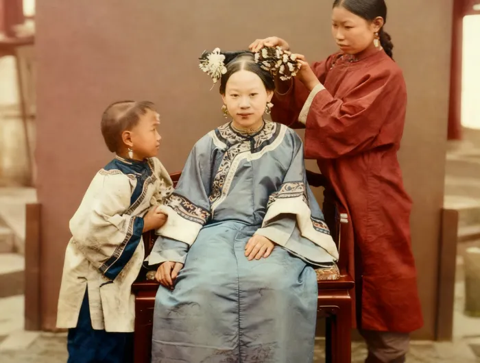 第一张最抓人眼球的,不是衣服有多贵,而是那种被人伺候着梳头的日常感。中间坐着的小姐,神情平静,蓝色衣袍宽大又整洁,袖口和衣襟上都有细细的花纹,颜色不算张扬,但一看就不是普通人家的穿戴。头上的发饰也很显眼,一边一簇,梳得整整齐齐,身后女仆正伸手整理,旁边还有个小丫头凑近看着。