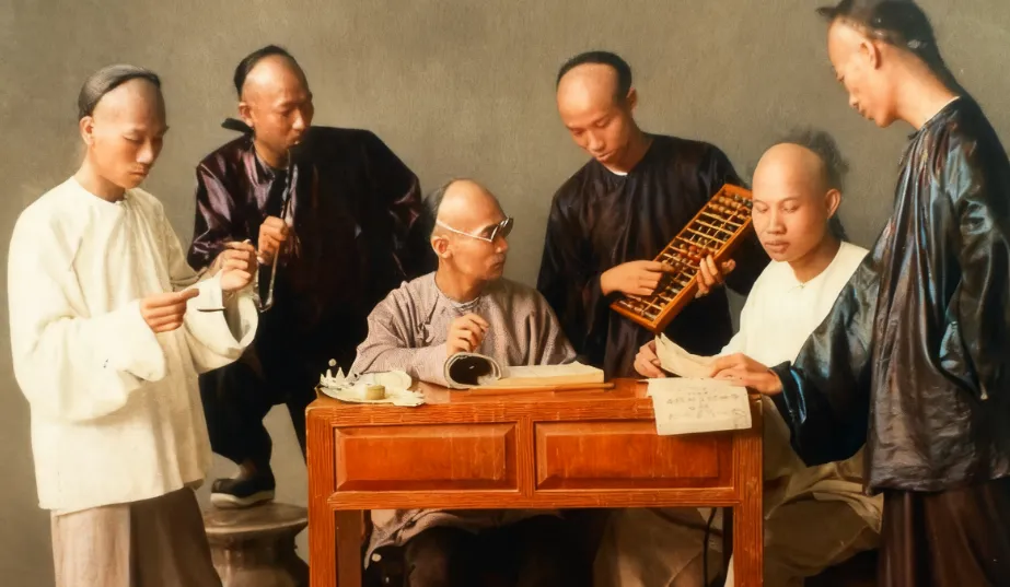 以前的账房先生,和今天很多人想象中的“记账的”还真不一样。他们不只是会拨算盘,还得识字、懂规矩、脑子清,很多商号里,账房的分量是很重的。照片里这几个人都剃着半秃的发式,穿着长衫短袍,表情认真,整个场面竟有种安静的紧张感。那时候做生意,没有电脑,没有手机,账全靠人一笔一笔记,算盘珠子一响,就是一天的营生。这样的场景,你现在在街头已经很难看见了。