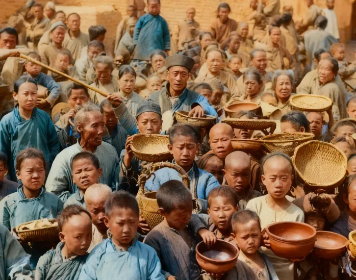 第三张看着就有点堵心。镜头里挤满了人,老人、妇人、孩子,全都把篮子、筐子、木盆端在手里,眼神直直地望着前面。人太多了,多到你一时都不知道该先看谁。可越是这样,越能看出那个年月过日子有多难。