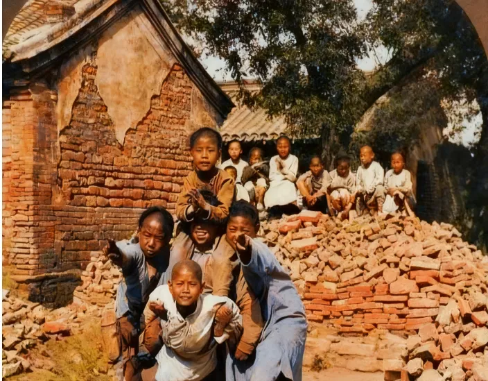这张照片特别有意思的地方就在这儿:**环境很旧,很破,可孩子的精神头一点不弱。**那个年代的玩乐项目当然少,没有玩具店,也没有动画片、手机和游乐场,很多快乐都是自己找的。一堆砖头、一块空地,几个伙伴,就能玩上半天。你要是不说年份,这种孩子气其实和今天也没那么远。只是现在的孩子,很少再有这种“满地跑、随手玩”的野劲儿了。