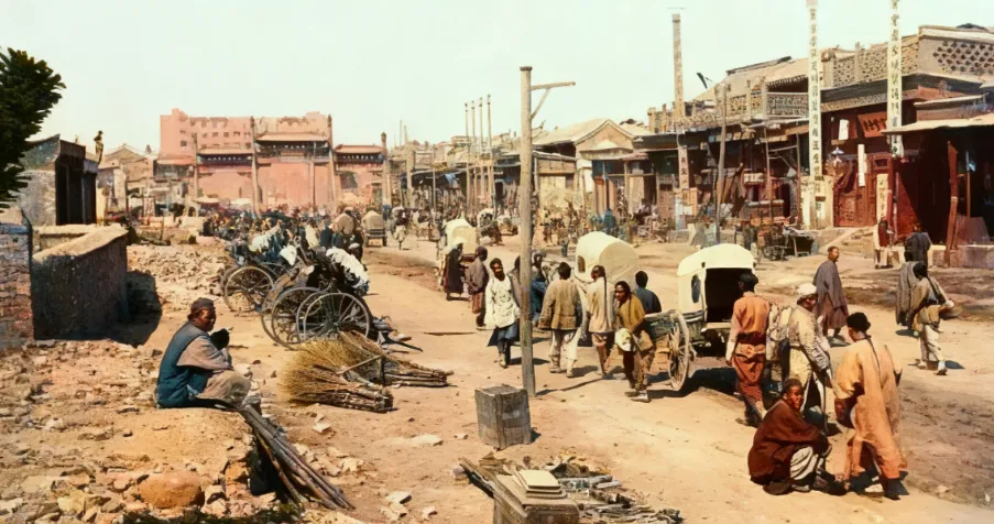 最后一张,是一条很有味道的街。街面挺宽,可全是土路,黄包车、行人、牲口车混在一起走,路边房屋高高低低,招牌旗幡竖着,远处看着热闹,近处看着粗粝。那种晴天一身土,雨天一脚泥的感觉,几乎能从画面里冒出来。