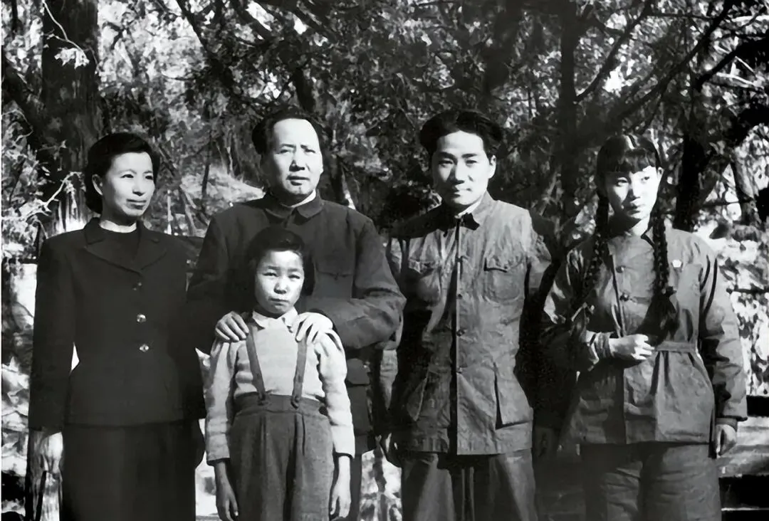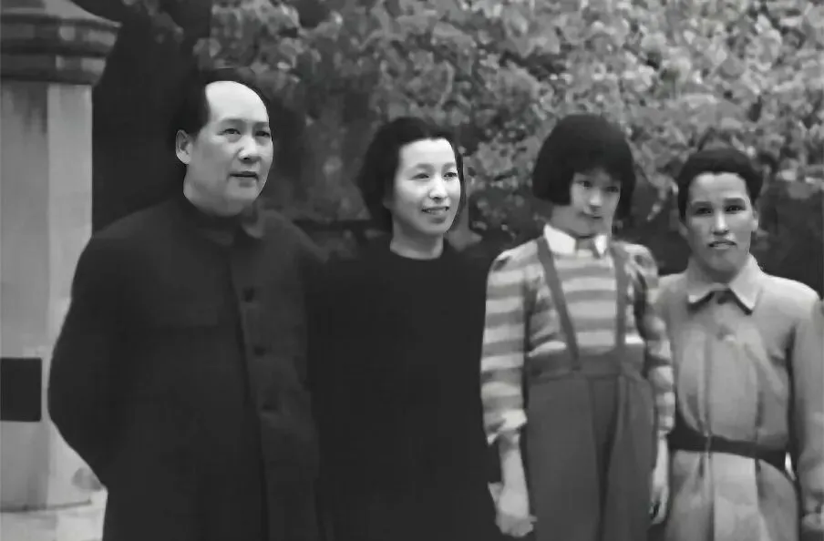 四个人站在树影子底下,这一站就是半个世纪前的家常,中国家庭照片的老底就这么落住了,左边毛主席,身材魁梧,脸上的笑容遮也遮不住,紧挨着江青,脸上带着点少女的明亮,眼角全是光,第三个小姑娘穿着吊带裤,斜着眼精灵古怪,那就是李讷,最右边则是江青的同父异母姐姐李云露,衣服都有点肥大,那个年代孩子穿旧衣都爱挽袖口,我小时候隔壁小姊妹也和她打扮差不多,家里一旧就是全家都旧,衣料硬朗,笑容倒谁也藏不住。