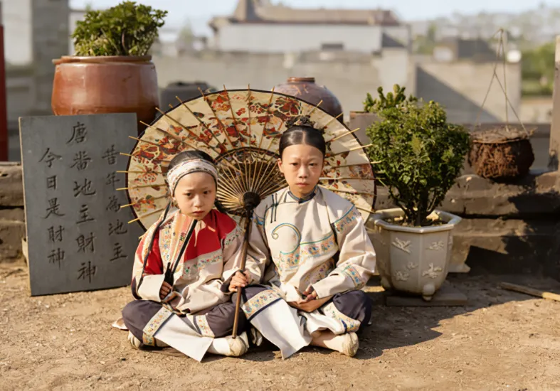 再看这两个孩子,脸上都没什么笑意,尤其姐姐那种端着坐、直直看镜头的样子,很有那个年代拍照时的拘谨。不是她们不高兴,更像是当时照相本身就是件郑重事。衣袖宽大,滚边细密,头饰也不是普通人家随便能配齐的。以前总觉得晚清照片里的人都“没精神”,可仔细想想,那时候照相时间长,人又得坐稳,摆出笑容反而不容易。要是不说年份,你会猜成什么时候?