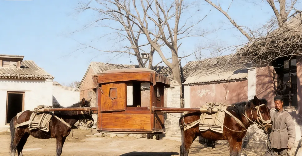 这一张很有意思,院子里停着一顶木轿,两边不是人抬,而是两头骡子分列前后。说实话,我以前也只是听过“骡驮轿”这个说法,真看到照片,才知道它比想象中更像一件正经运输工具。轿厢做得很厚实,木头颜色发亮,门窗规整,不像临时拼凑的,明显是长期使用的东西。