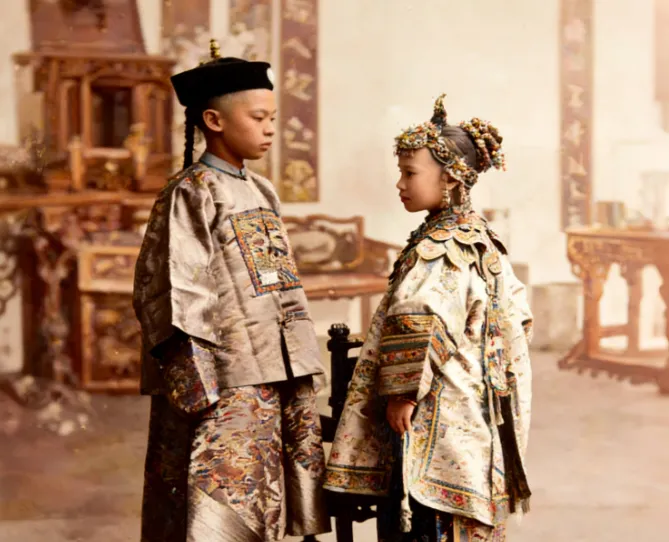 这种照片最让人难受的,不是“旧”,而是那种明明是大人的礼制,落在孩子身上,却显得特别不合身。他们可能都还没真正明白婚嫁意味着什么,就已经被摆进了这个位置里。以前看历史书,童婚只是几个字,可放到照片里,就一下具体了:衣服是真的,头饰是真的,孩子脸上的茫然也是真的。照片里哪个细节最让你意外?我个人最先注意到的,是那把椅子和他们之间的距离,像是仪式在中间,人反倒被安排在了两边。