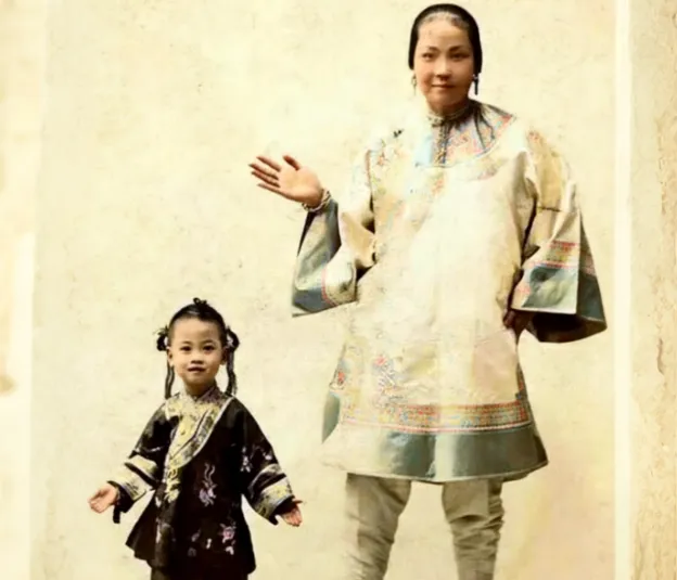 母亲穿的是宽身长袍,裤脚收得紧,还是那个年代常见的样子,但她脸上的神情并不苦,反而有点温和。很多人总以为清末女性留在镜头里的样子都是沉重的,可这张不一样,它没有故作庄严,反倒像家里人想留下一张“带孩子”的纪念。别看只是一个抬手的小动作,那个年代的生活气,一下就出来了。