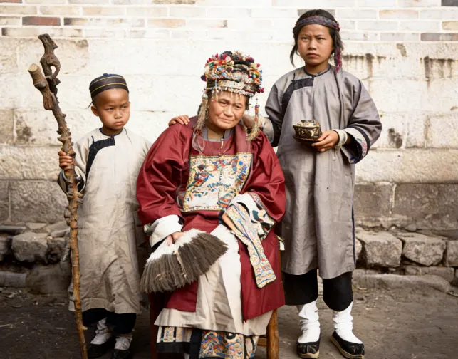 最后这一张,分量很重。中间这位老太太穿着深色礼服坐在椅子上,胸前补子、头上冠饰都在,可最让我注意的,是她那股不怒自威的坐姿。旁边一男一女两个孩子站着,一个拄着样式很怪的杖,一个捧着碗盏,像是陪侍,也像是刻意搭配出来的合影构图。