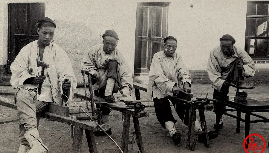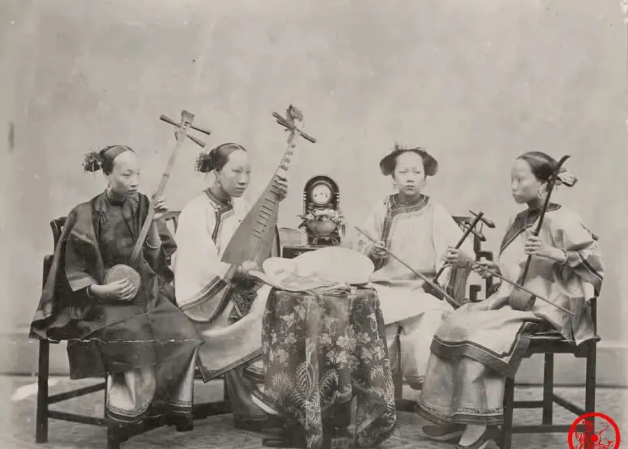 这组照里的女乐师真有看头,四个人都抱着乐器,琵琶、二胡、三弦,一个不拉下,额角全露着,发际线极高,眉眼之间透着专注认真。大伙儿正襟危坐拉曲子,气氛一点不比正规场合松,每次只要爷爷听见这种照片里的二胡声,总嘟囔一句,“调子正,散场都带着余音上席”。