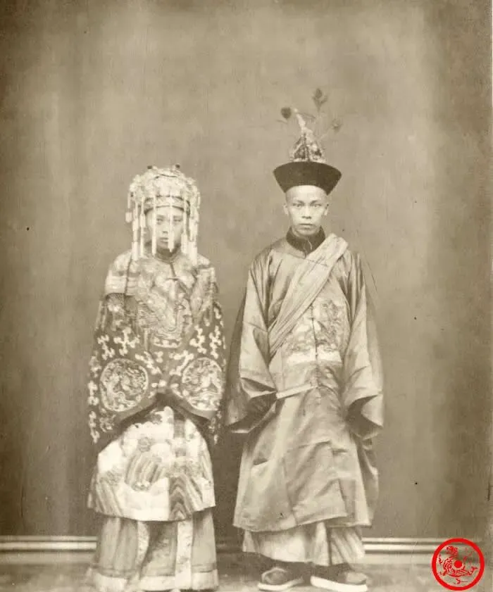 这张可不多见,新娘凤冠霞帔披得厚重,新郎身上一件官员补服,斜跨红绸子,两个人站成直板,明知道是新婚脸上却完全没笑。不熟悉镜头,那年代面对照相机都木木的,气氛一板一眼,谁要脸皮子厚笑出来,反倒成了怪事。妈妈以前说过,“那时候合张影,全家都跟上,少一人都不肯拍,结婚照更是当传家宝”。
