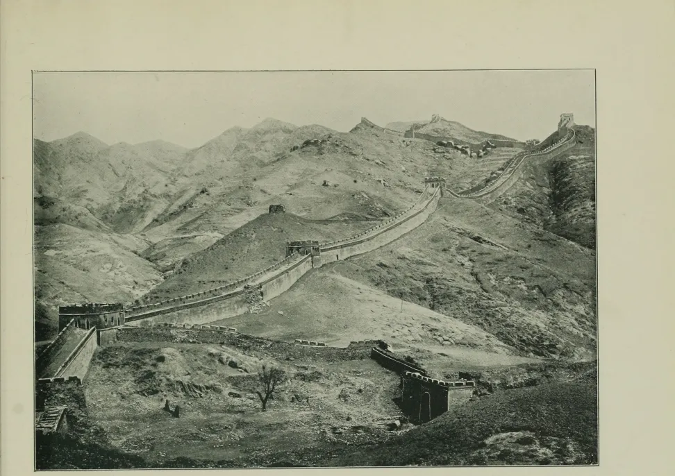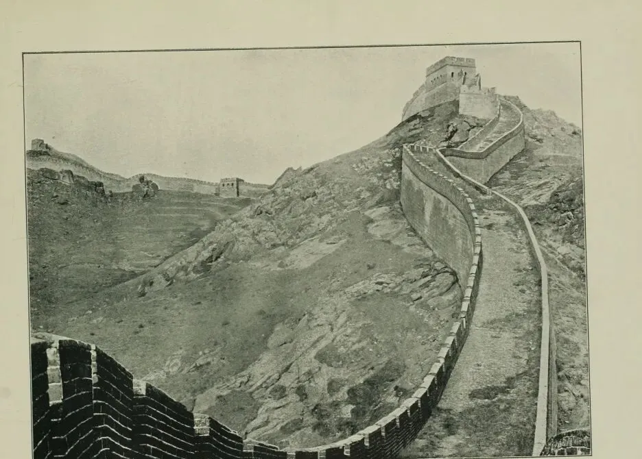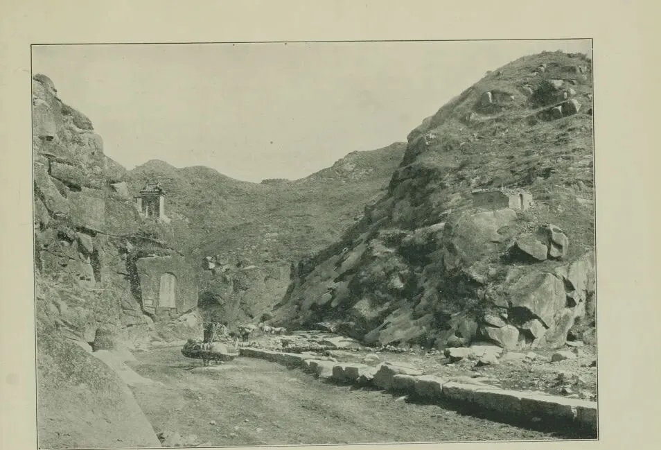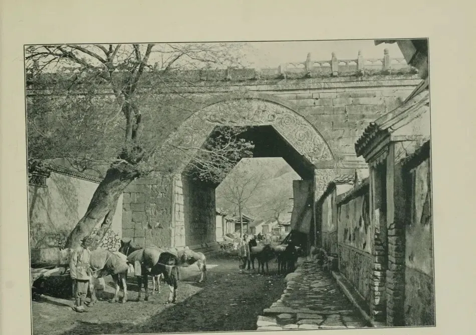 这张里头的那座大石头券门,叫居庸关,京北出来的头号要隘,老子辈管这儿叫"九塞之首",谁家送人走西口,十之八九都得从这穿过去,门洞子上满是花纹石雕,正中间还蹭着一棵老树,马队人影全都挨着墙根打转儿,墙头瓮城早就残破,石缝间塞满青苔苔皮,地上一排马鼻泡印子,都是真正走南闯北的人留下的脚气味,以前大爷们赶脚还在这歇过脚,说是石头太凉,晚上打盹贴墙根能捂着点风。