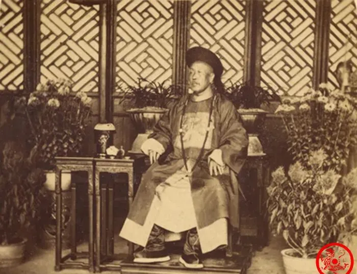坐在一堆菊花、兰草旁边的,是正儿八经的大员,帽子正着,官服笔挺,眉睛里挂着点松劲却不显松懈,手边的小几低矮,摆着个瓷盖茶、莲灯台,墙面是镂空二分纹样,那时候的家什讲究“景中有画”,后头还能瞧见大大小小十来盆花盆,都是讲究人家的规矩,拍照的时候神色沉着,这份威严不是装出来,是习惯了坐在堂上一提声没人敢吱声。
