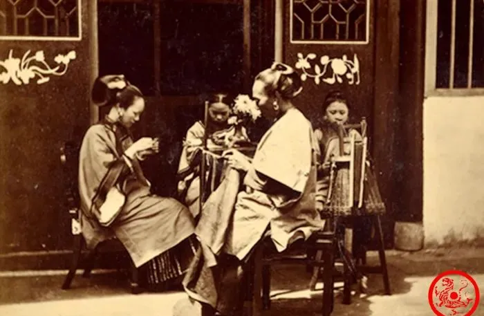 看这几位端坐门口,手里忙着针线活,衣角绣片晃着亮,一人低头一人斜靠,衣服花边带着光,和旁边的绣墩茶几搁在一起,阳光照下来全是一股老宅子的静气,能有闲工夫坐下来说话,夹着针脚说上一会家常,比开会都稀罕,现在的家,从早到晚都见不着这样慢细活的场面。