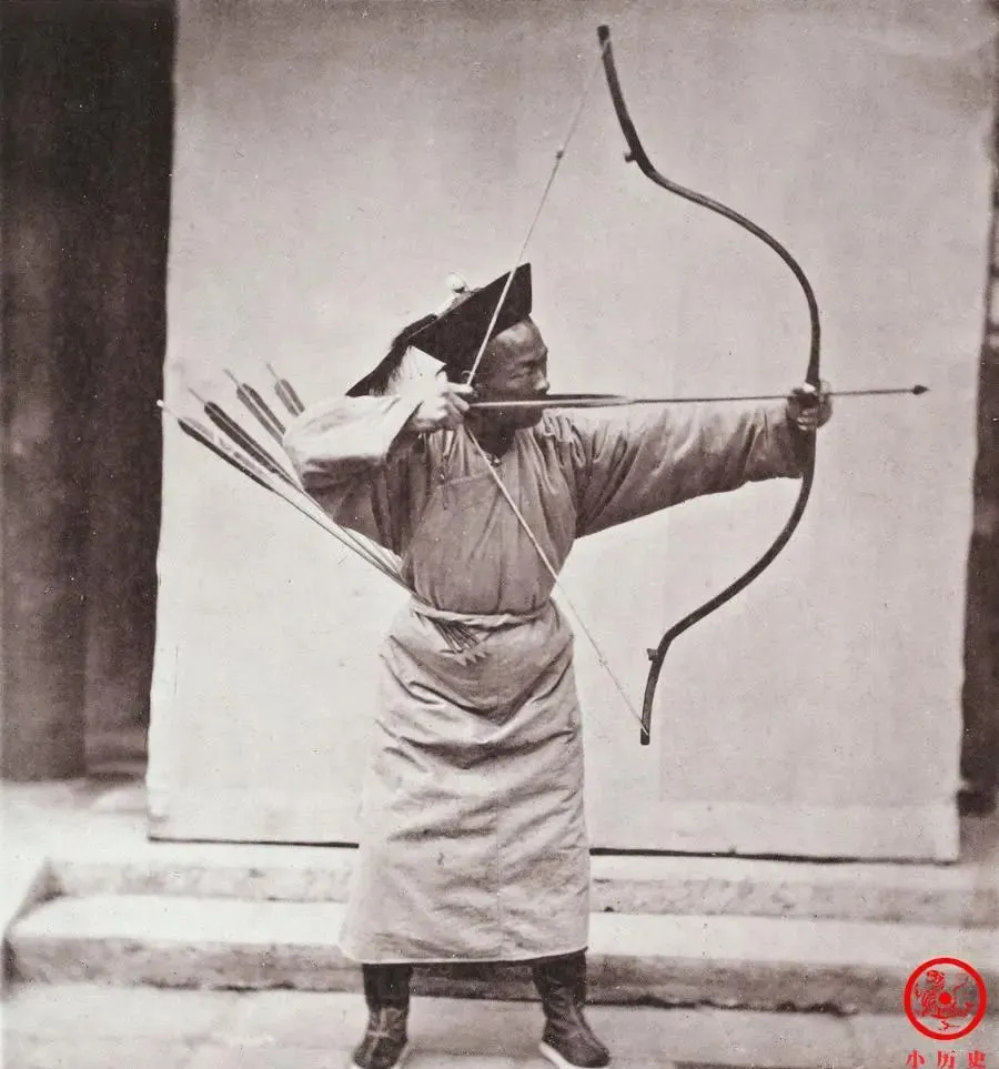 这张照片里站着的这位,满身□□汗,手里拉着一把大弯弓,腰上插着好几只箭,清军讲究骑射,哪怕那阵子洋枪大炮都来了,这手艺还死活不愿意撂下,弓拉得满满的,脸上绷紧劲,箭矢对着前方一点不松,练这么多年,甩出去的每一箭都是力气和章法,小时候家里大人还念叨过,武举考核要真上靶才算数,说那时候当兵的,射箭是大本事,出门带着点底气。