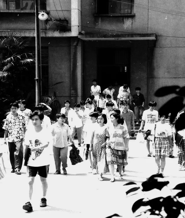 这张很有味道,像是第一场考完,人从教学楼里往外散。有人快走,有人低头想题,还有人已经开始和同伴对答案。80年代的夏天热得厉害,水泥地一晒发白发烫,衣服后背很快就湿。可那时候顾不上这些,最先问的总是:“你作文写完没有?”