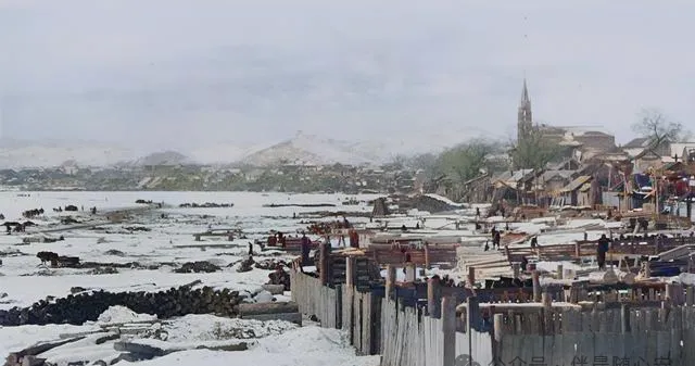 这张最先让人记住的,不是雪,而是雪里还有那么多人在忙。江面冻着,岸边木栅、房屋、教堂和远山都压在一片白里。看着冷,可生活没停,人还是得装卸、赶路、做买卖。旧时东北很多地方就是这样,冬天不是休息,是换一种法子接着过。