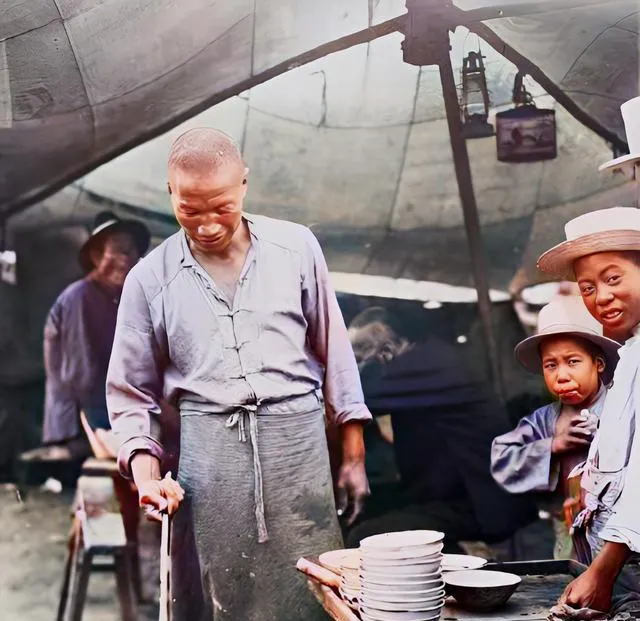 这像是个临时搭棚的小饭摊,案子上摞着碗,摊主正低头忙活。旁边孩子探着头看,神情很鲜活。旧社会的街头吃食,大多不讲排场,讲的是快、热、顶饿。一个灶、一张桌、几只粗瓷碗,就能把往来人的肚子安顿好。
