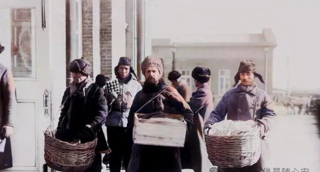 几个人提着大篮子,穿得都很厚,像是在冬日街头卖吃的或杂货。天越冷,买卖越不容易做,可也越不能停。这样的流动小贩,在老东北街头很常见,靠一双脚、两只手,把货送到街面上。今天看像旧照片,当年看就是最普通的一天。
