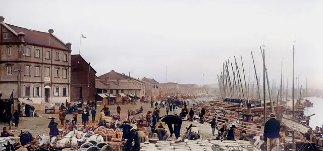 这一片码头真热闹,船桅密密地立着,岸上全是人和货。东北并不只是关起门来过日子,很多地方早早就和外面的贸易接上了。鱼货、粮食、杂品、布匹,能从船上来,也能从船上走。你站在这种地方,会觉得一座城的气口都开在水边。
