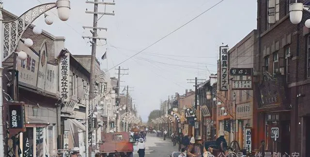 街两边挂满招牌,还有电线杆、路灯,这画面一下就把东北“旧而不闭塞”的一面显出来了。商铺、洋行、广告牌并排站着,说明那时的城市已经很有近代街市的味道。很多旧生活,就是在这种半新半旧的街道上慢慢改样子的。