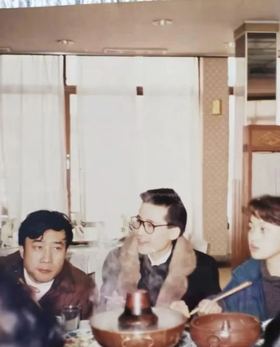 这几位一个个都有说头,左边那位表情严肃,其实刚拿了大奖,劲头还在,旁边的男士戴副眼镜,笑起来有点儒雅劲,女演员在右侧,发型是90年代流行那种蓬松波浪,穿着牛仔夹克,夹起一片肉投入锅里,神态专注得很,爷爷说过去的演员没架子,和普通人比邻而坐,锅气氤氲里才能见见真性情,三人围一桌,说笑声和锅底噼啪的共鸣,现在大明星请客多是私房菜,真要像以前这种围锅而坐已经稀少了,这份烟火气有点被时光拉远了。