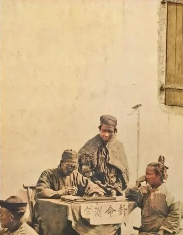 图上这摊子就是算命先生的小桌儿,旧屋的墙根下,桌布歪歪地罩着,手写的“命卦测”字眼勾着过路人的眼睛,先生盲着双眼,脑袋埋低,黑帽一带,外头披个半旧葛衣,带着些灰渍,看得出不是新穿,桌子旁围了一圈端着饭碗的人,眼神有探头探脑的,也有打量先生的,真是那种靠一门小手艺支撑起一家口的节奏。旁边有个孩子,脸没什么表情,衣服旧成一片,袖管垂成了带子,去年穿的今年“再凑一阵”,在那年月,有个地摊能混碗饭吃,已经算安稳过了。