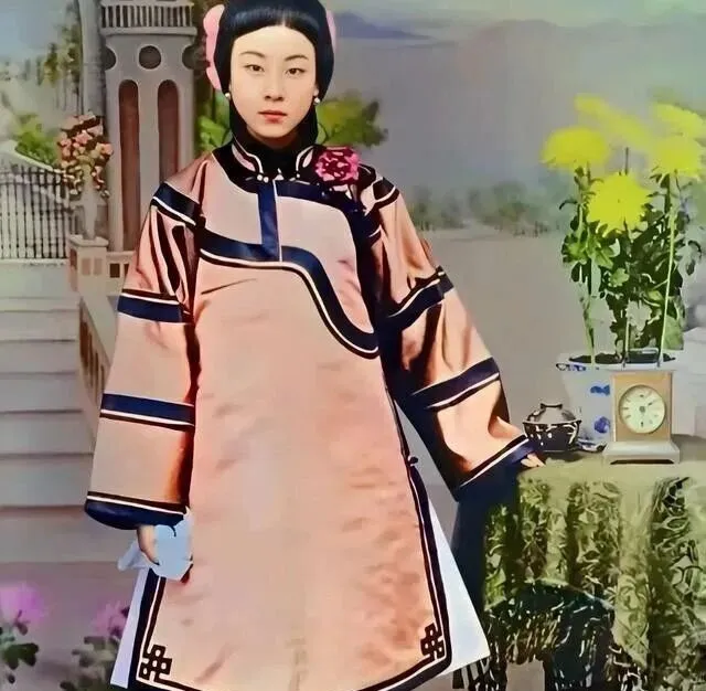 镜头里的女子一身光鲜华服,绸缎布料泛着亮光,黑色滚边配粉色花纽扣,衣袖宽阔,裙摆直溜,耳环配得整整齐齐,胳膊轻轻搭在桌边,手上还攥着什么细软,屋里边摆着瓷瓶和机械钟,窗外有花,气氛带着点西洋腔调,这姑娘就是传说里后宫美人里的那一类,一笑就有风情,可这样的美丽,爹妈说,那是别人家的福气,福气能不能兜住,难说。
