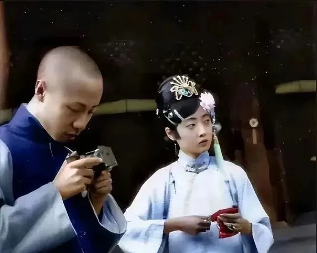 细看这张照片,一个青年穿着深蓝袍服忙着摆弄东西,旁边的姑娘微微侧目,头上插着金玉发簪,衣领银白干净,手里捏着信封,场面清静而拘着,像是家里说的那种“大事小情都得守规矩”,他们神情严肃,头从来不敢随意晃,这一种绷出来的规矩感,现在再见只剩一股旧醒木的味道。