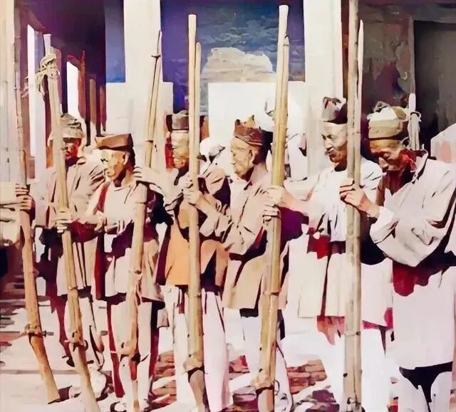 一排瘦汉子肩上扛着长枪,帽子各有各的形,衣服全干瘪着,胳膊没多少肉,站得七扭八歪,腰板直不起来,那政策菜还是要撑起来当样子,只是这股旧劲儿,看得出一天要熬多少事儿,长枪意气又有啥用,日子紧凑得没法宽余。