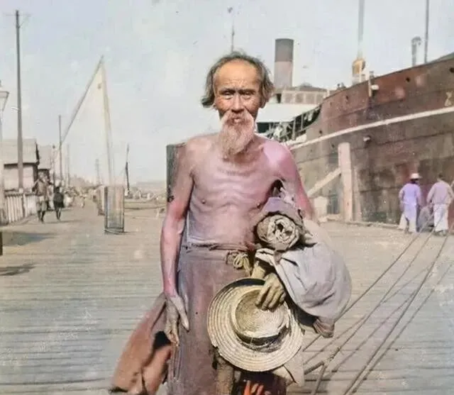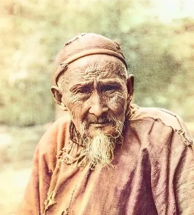 这位老大爷顶着小帽,稀疏的胡须,眼神凛得很,衣服破旧,领口露着棉絮,整个神态里写着操劳一辈子的疲惫,和现在的小伙子站一起,估摸着岁数差着好些,可那会子营养跟不上,四五十看着就像快七十。