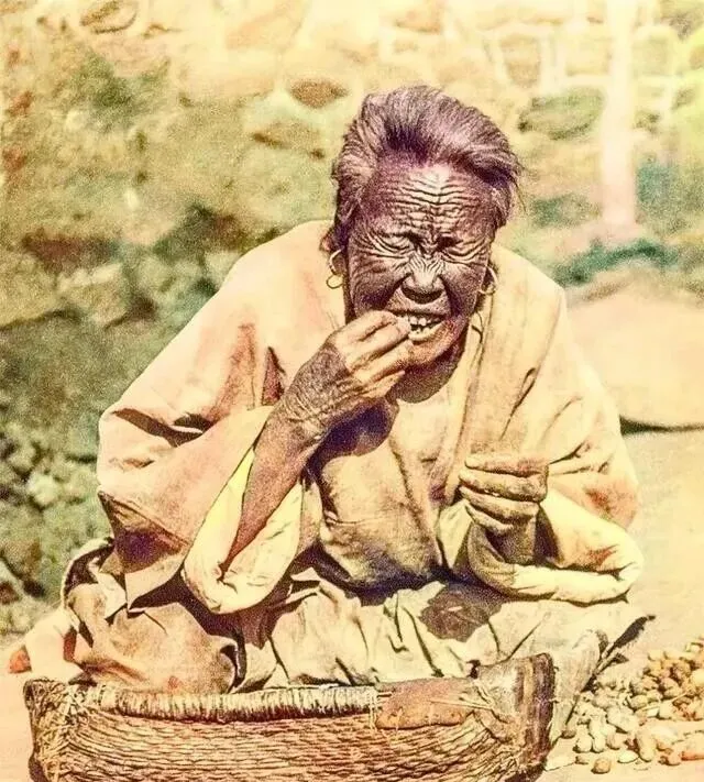 这老奶奶蹲地上,篮子一旁,埋头往嘴里撮东西,脸上一道道沟壑,皱纹深得像旧树皮,衣角袖口都蹭得泛白,有点像以前村口晒太阳的老人,啥都不图,能有一顿就知足,那年代的老人五十来岁就沧桑成这样,真是不比现在七老八十的精神气。
