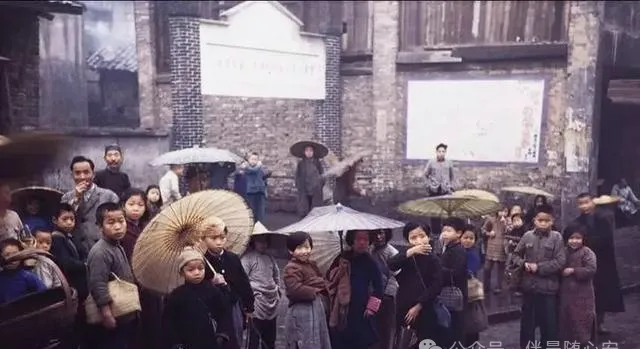 这一张很有生活现场感。人群撑着伞站在街边,孩子、大人、门楼、旧墙都在画面里。老照片最迷人的地方,就在于它不只拍人,也顺手把当时的街景、穿着、出行样子一并留下来。那时的街头没有今天这么亮堂,却有另一种热闹:鞋底踩在石板路上,伞骨一撑开,叫卖声从街口飘过来,邻里之间抬眼就能认出是谁家孩子。旧日子并不总是宏大,它更多是这样一幅幅挨着过的寻常场面。