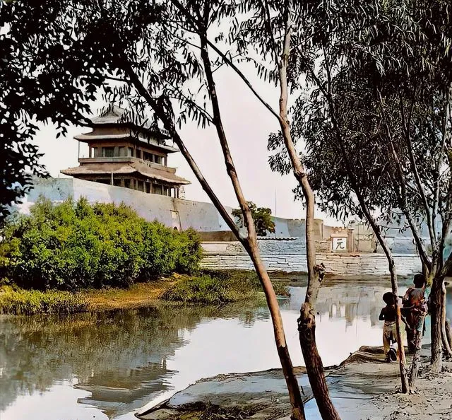 这一张一下子静下来。树影、水面、城角楼,看着像画。可这地方以前也实用,河边能洗、能挑水、能歇脚,夏天孩子爱往边上凑,大人一边说话一边看着,日子慢,却不空。