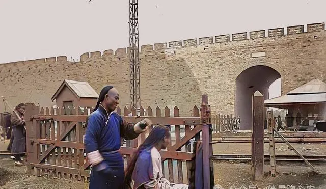 这张里的人物一下把旧时代拉近了。辫发、衣着、站姿,都不是摆拍,是当时真有的样子。城墙再大,也得靠这些来来往往的人把它衬活;没有人,城只是空壳,有了人,才叫城生活。