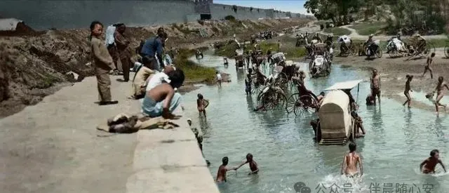 孩子下水,大人蹲在岸边,车子也停在旁边,这就是过去的夏天。那时没空调,连电扇都不是家家有,护城河边能洗、能泡、能解暑,笑闹声顺着水面飘,和城墙的沉重正好对着看。