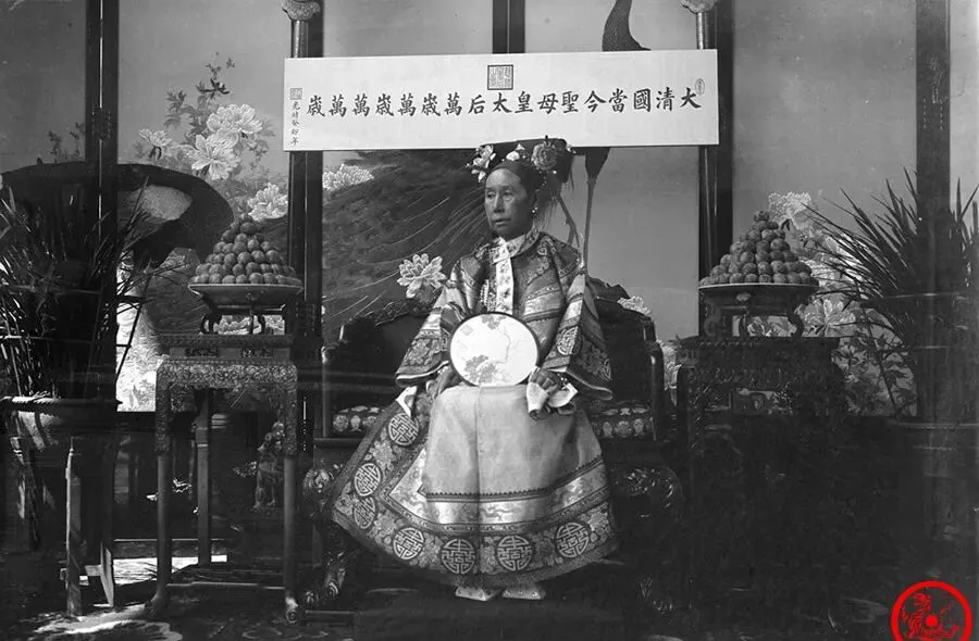 这张正襟危坐的就是慈禧太后本尊的照片,细瞧着,穿得一身绣龙大袍,头上珠翠满挂,手里还抱着一把团扇,背景摆着花屏风和果盘,细节一层套一层,连摆设里的水果盘都不是随便搁的,桌子腿上那雕花也细,下笔不俗,旁边写着贺寿的匾额,说起来这张肖像可不是拍着自己留念,根子里是琢磨着让洋人看看“我还在这儿坐镇的”,那种高高在上的劲儿,隔一百多年都瞧得见。