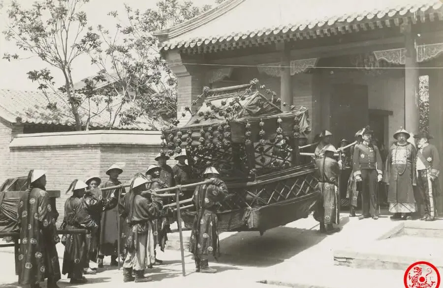 图里的这个大架子叫黄亭,可不是一般的轿子,慈禧照片出宫送到使馆,就得用这样的黄亭抬着,又高又宽,外头还有细密的垫子和绳子,押队那阵仗像是一场仪式,前头还有伞盖和扇面,随行的侍卫一水朝服,脖子上清朝的标志大辫子甩在脑后,光从路上走过就得吸引一大片人跟着看热闹**,我记得家里老人说起来,宫门口要是动静大点,整个胡同都会传开,大家都琢磨今天又要办啥大事了**。