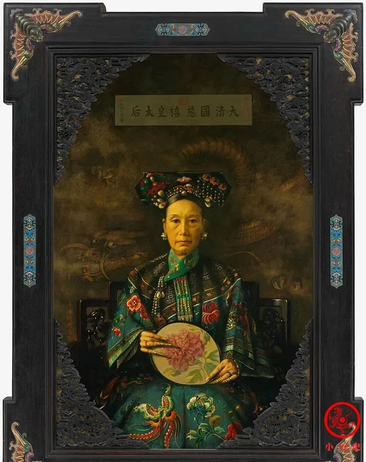 图中这幅西式油画像,比刚才那张照片来得更大更重,边上大镜框黑漆描金雕得花团锦簇,走美国那路子,画上颜色亮堂堂的,慈禧脸上一板一眼,穿戴上似乎还多了点西洋味儿,这幅画像1904年大老远运到美国,当年专门挑了特殊货车运,陪下馆子和合照这种事,后面都成了老美人嘴里的传说,你别说,这画架要是现在能见着,肯定博物馆头等展品。