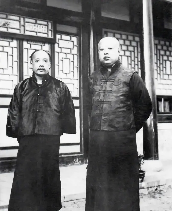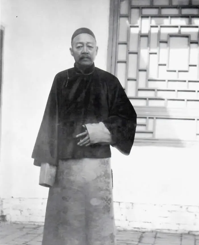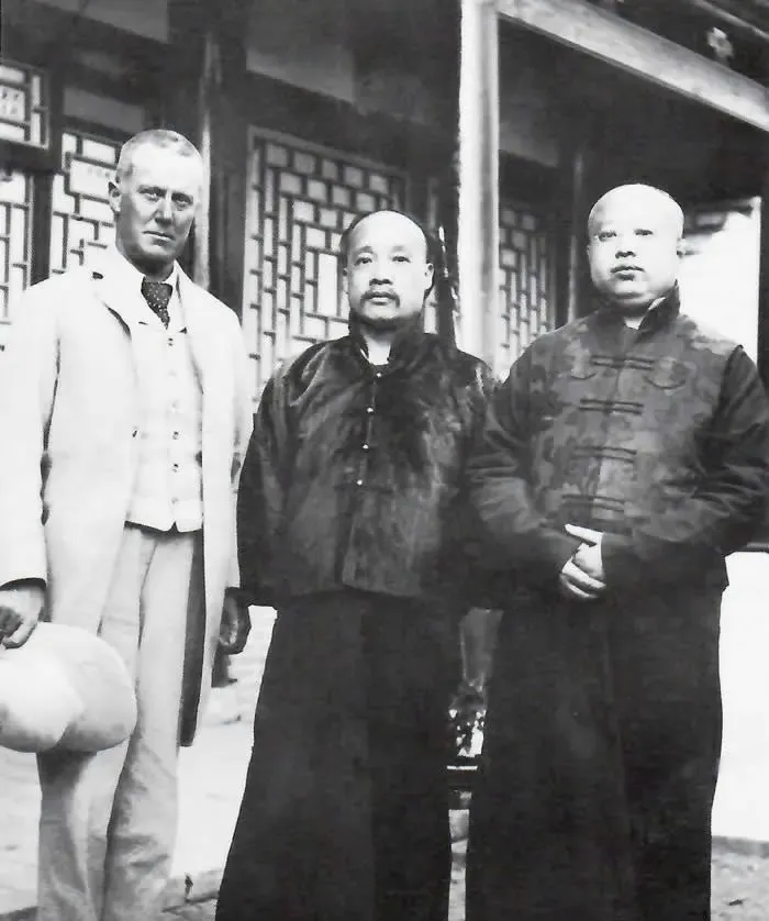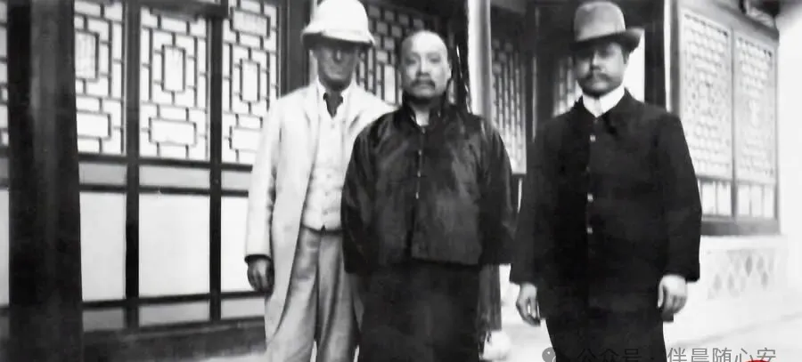 这张照片一眼就能看出时代变了。中间还是旧式长袍短褂,身边的人却戴着礼帽、穿着西装外套,像是把两个时代硬摆在了一起。老辈人以前见客,最看重衣冠整肃;到了这时候,和外国人合影、接触,已经成了上层人物生活中的一部分。可你再看善耆本人,站姿还是稳,神情还是收着,那种旧式王公的架子没散。也就是说,外面世界在变,他的日常讲究并没有跟着一并撤掉。院子还是中式院子,窗棂还是老样子,只不过来往的人,已经不全是穿马褂的了。