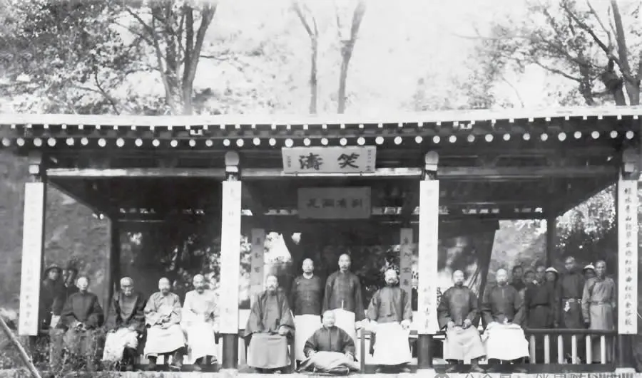 这张合影更像一场旧时会客的留影。亭前坐着、站着这么多人,衣袍整整齐齐,位置高低、前后次序,一看就不是随便站的。过去这种场面,常常和宴集、议事、接待地方士绅有关。人还没说话,座次已经先说明了身份。最有意思的是那座亭子,它不是单纯拿来看景的,旧时候这样的园亭,也是待客、歇脚、聊天、看戏的地方。茶端上来,盖碗一掀,轻轻一拨茶叶末,旁边人低声接话,那种边地却仍讲排场的生活气,一下就从照片里冒出来了。