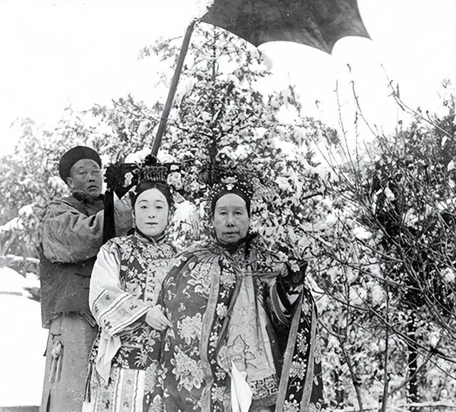 下雪的时候也照相,那可是讲究事,两个女人站在前头,后头太监举着大伞,树杈上挂着雪,屋外冷得扎人,披肩和刺绣衣太厚,压得肩都不宽了,小时候总以为这种衣裳是舞台装,后来才知道,真穿得住的东西,都是用来抵得住气场的,妈妈说“雪大风冷,不敢松快”,照片里人虽然没动,感觉那一身“沉”,窝在心里一直散不掉。
