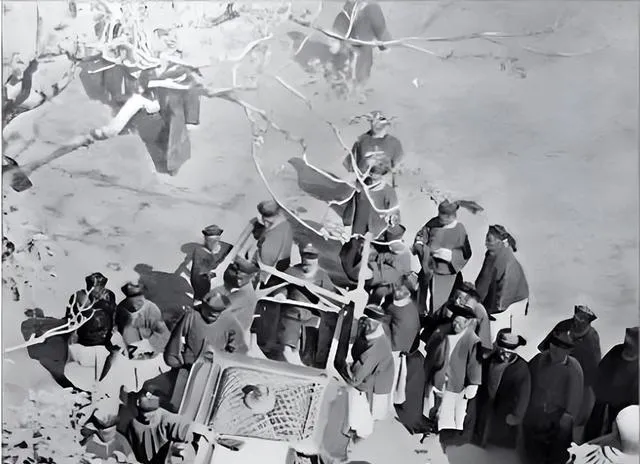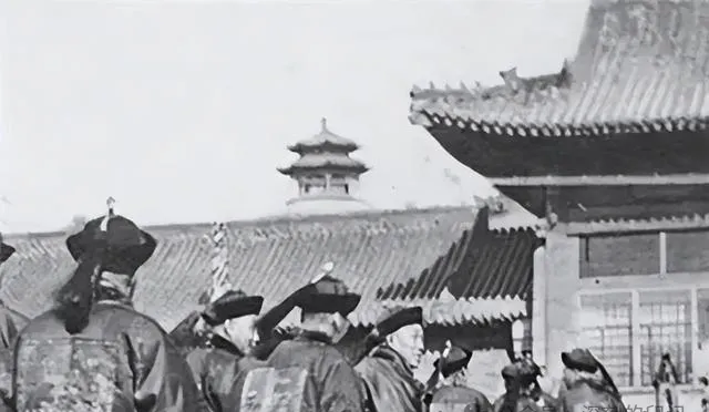 最后这张,宫外聚的官员队伍,以前总说老照片里人都站得整整齐齐,再看这一堆,不是每个人都板着肩,有侧身的,有回头说话的,补服一块块贴着,帽翎和翎管搭下来,气氛已经不是早年那种“一丝不苟”的板正感,有的人脚都迈到外面去了,这才是真模样,讲究还在,但松快也出来了,时代没准就是从这些“小不一样”里一点点变了味儿。